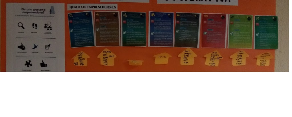 Seguidament vam fer una fitxa on teníem que valorar-nos i explicar quines qualitats podíem donar com a emprenedors/es i després ho vam escriure a un póster de la nostra cooperativa. Ara sabem que tenim moltes coses en comú i que podem aconseguir tot el que ens proposem si fem una bona cohesió entre tots.