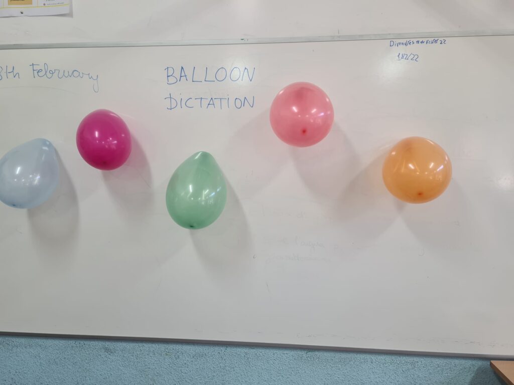 Es alumnes de 3r practiquen writing skills in English amb un balloon dictation. S’ho passen d’allò més bé petant els globus descobrintvels missatges escrits amagats, escrivint en anglès i praticant el vocabulari i les estructures gramaticals posades en pràctica.