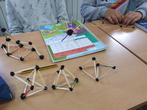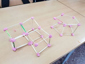 També classifiquem poliedres, en construïm varis en grup i després descobrim  patrons que els permeten classificar-los. Ens fixem en el nombre de vèrtex, d’arestes i de cares.