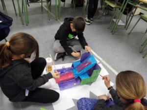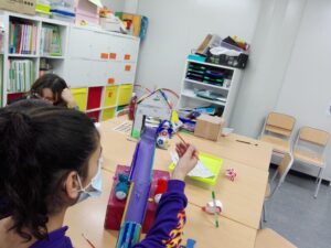 A la classe de 5è A hem estat dissenyant ginys per tal d’aconseguir un objectiu: Que una pilota petita avanci 20 cm o més. Ens hem anat engrescant els uns amb els altres, hem acabat decorant les “màquines” perquè quedessin d’allò més bé. El mecanisme que més hem utilitzat ha estat el dels plans inclinats.Hem fet dissenys, ens hem posat d’acord, hem après a solucionar petits problemes, ha estat fantàstic.