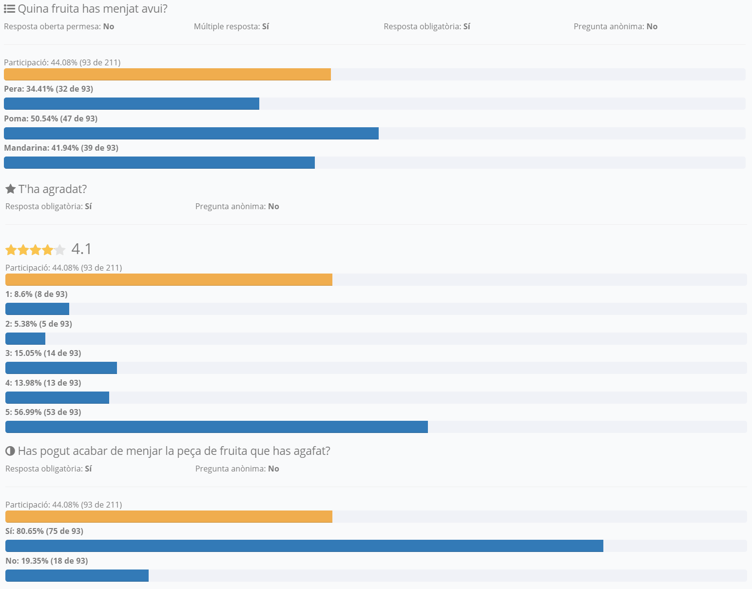 L’endemà vam fer una enquesta a tots els infants per saber quines fruites havien menjat, quines els havia agradat més, i aquest són els resultats: