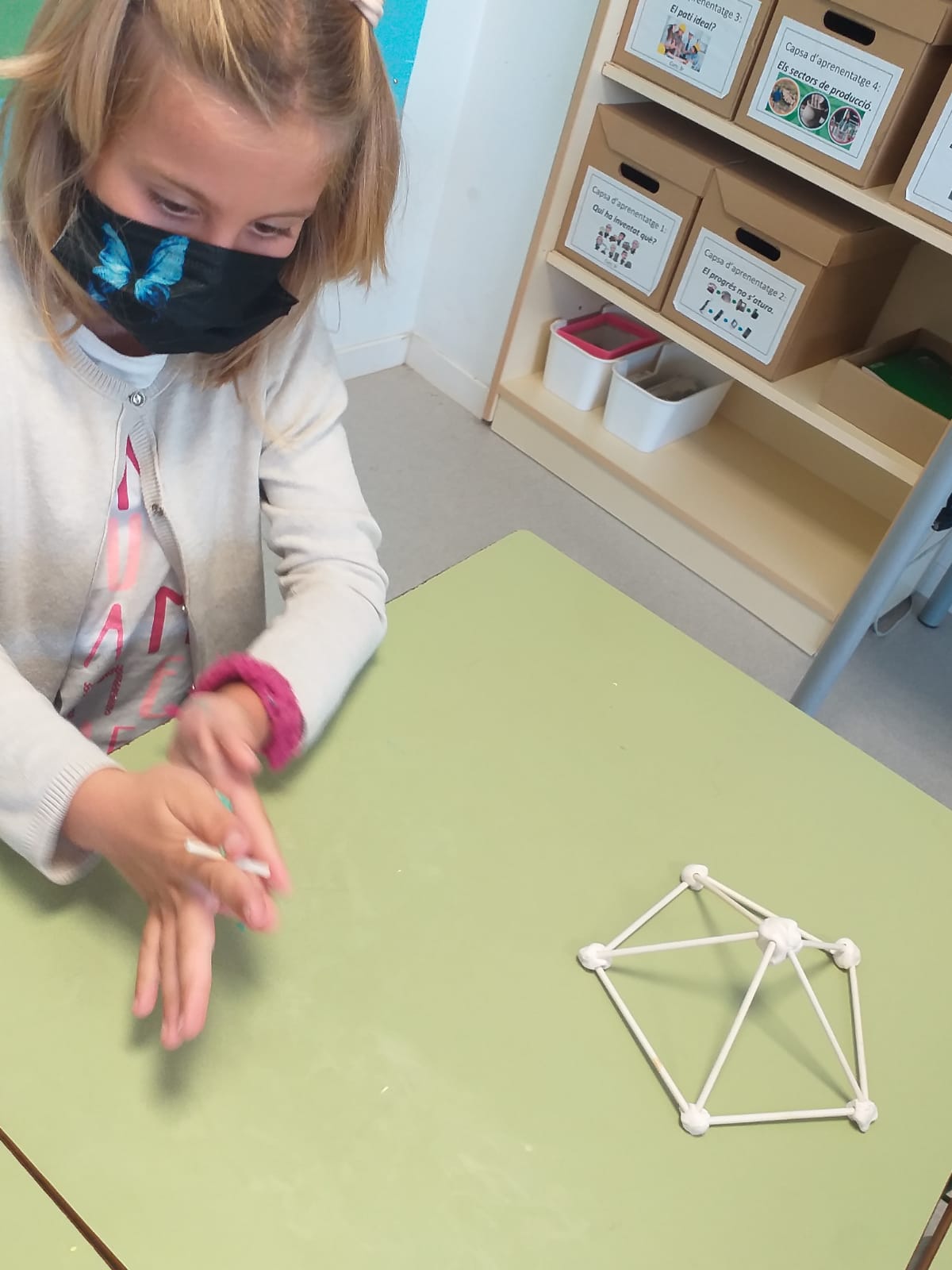 12/11/21Els nens i nenes de 3r hem estat treballant els poliedres. Per conèixer les seves característiques, vam construir-los amb pals i plastilina. Ara ja sabem que els poliedres tenen arestes, vèrtexs i que són figures amb volum.