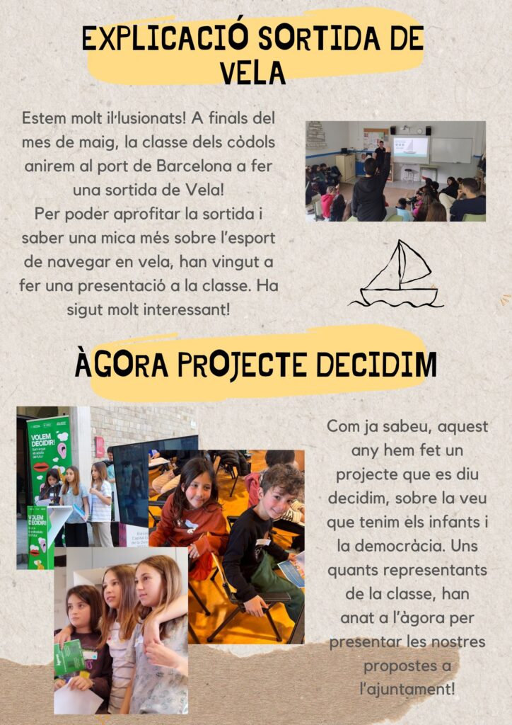 Notícies Montseny 5è – Sant Jordi, tallers del 2n trimestre, teatre anglès, explicació vela i àgora.