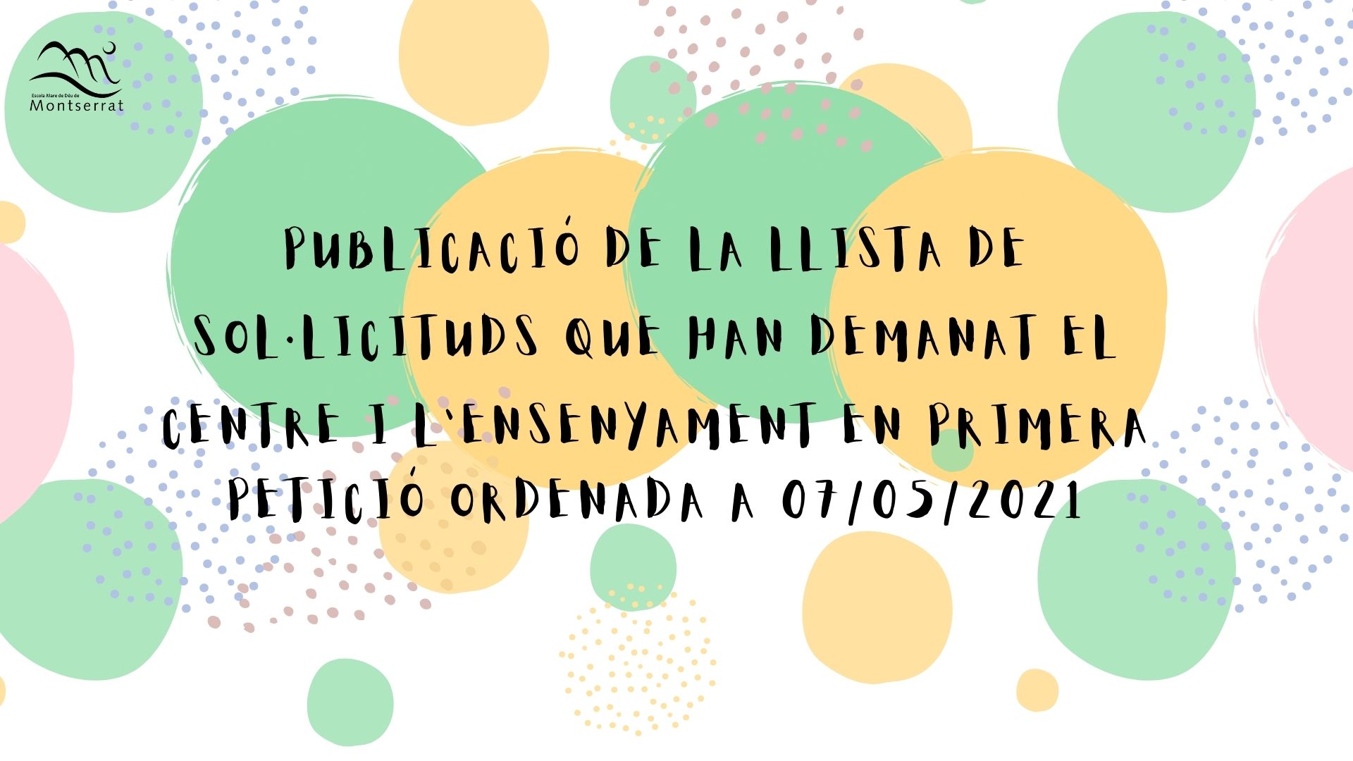 Publicació de la llista de sol·licituds que han demanat el centre i l’ensenyament en primera petició ordenada a 07/05/2021 Feu un comentari / Per admin / 7 de maig de 2021 / General Portada Ja podeu consultar la llista de sol·licituds ordenada de les peticions que han demanat el centre i l’esenyament en primera opció. Cliqueu a la imatge per accedir.