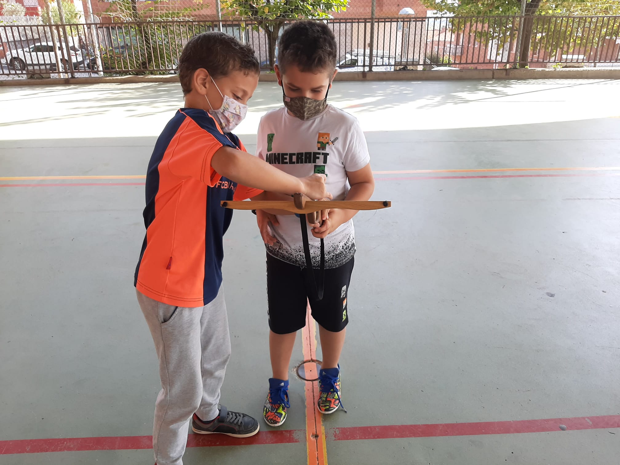 Després d’uns dies investigant sobre la vida i obra del personatge van descobrir que va inventar la ballesta. En Guifré i en Yeray que tenien ballestes a casa les van portar per ensenyar a la resta de companys i companyes i van aprofitar-les per fer una activitat de mesura al pati.