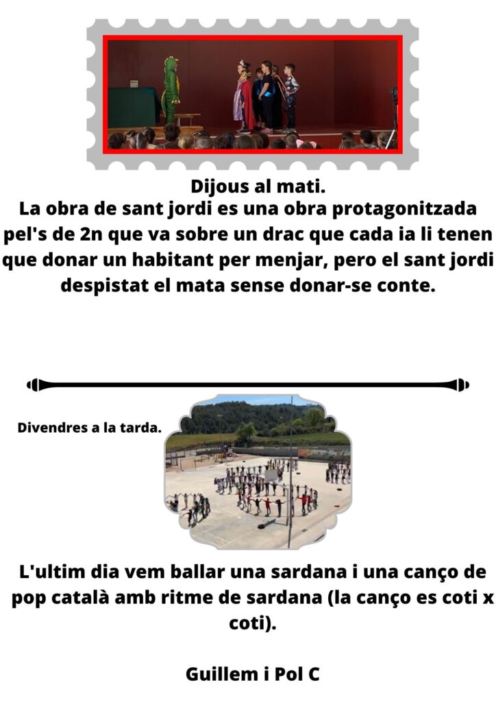 El segon dia ens vam despertar a les 7:30 vam esmorzar i vam anar a Ripoll amb tren. A Ripoll vam caminar una estona per arribar a l’scriptorium, on allà vam escriure amb la lletra antiga, i amb plomes! Vam dinar i vam anar al monestir de Ripoll. Ens van ensenyar moltes coses vam dinar vam jugar. Vam anar a l’alberg i ens vam tirar amb tirolina i vam trepar arbres i a la nit vam sopar i vam fer discooooo!!!!