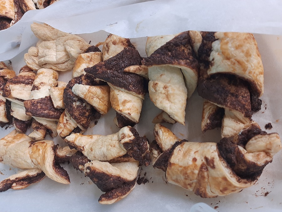 Els huskies es van posar els davantals i van començar a posar la xocolata a la massa. Després, amb molt de compte, van tallar i donar forma als croissants.