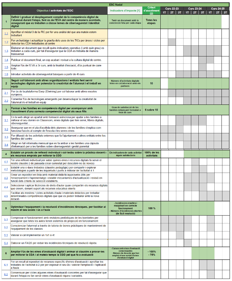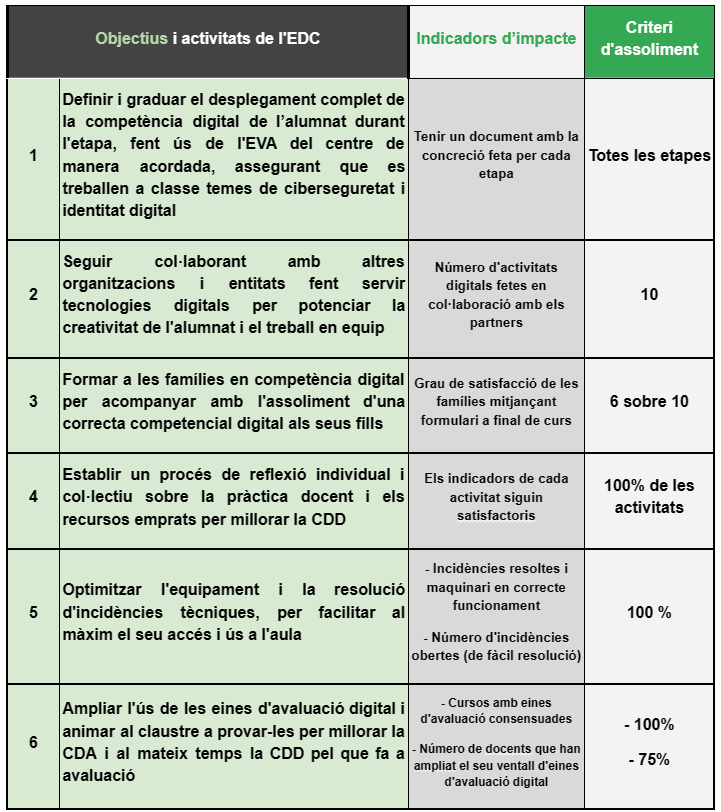 AVALUACIÓ La comissió digital realitzarà una revisió i seguiment dels indicadors d’impacte i els seus criteris d’èxit de cada objectiu i les seves activitats associades de forma regular. L’avaluació de cada activitat proposada per assolir els objectius es mostra al final de la fitxa de cada activitat, en l’apartat anterior. Aquesta revisió serà contínua, però