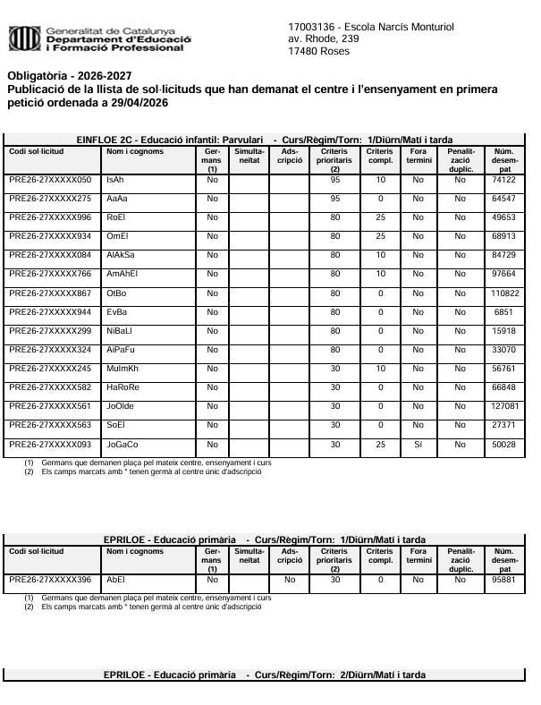 Publicació de la llista de sol·licituds que han demanat el centre i l’ensenyament en primera petició amb la puntuació provisional a 15/04/2026