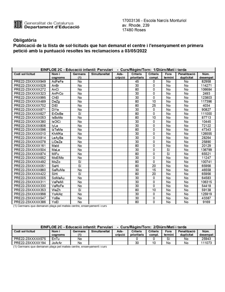 Publiquem les llistes amb la puntuació definitiva, un cop resoltes les reclamacions, de les persones que han realitzat la preinscripció al nostre centre: