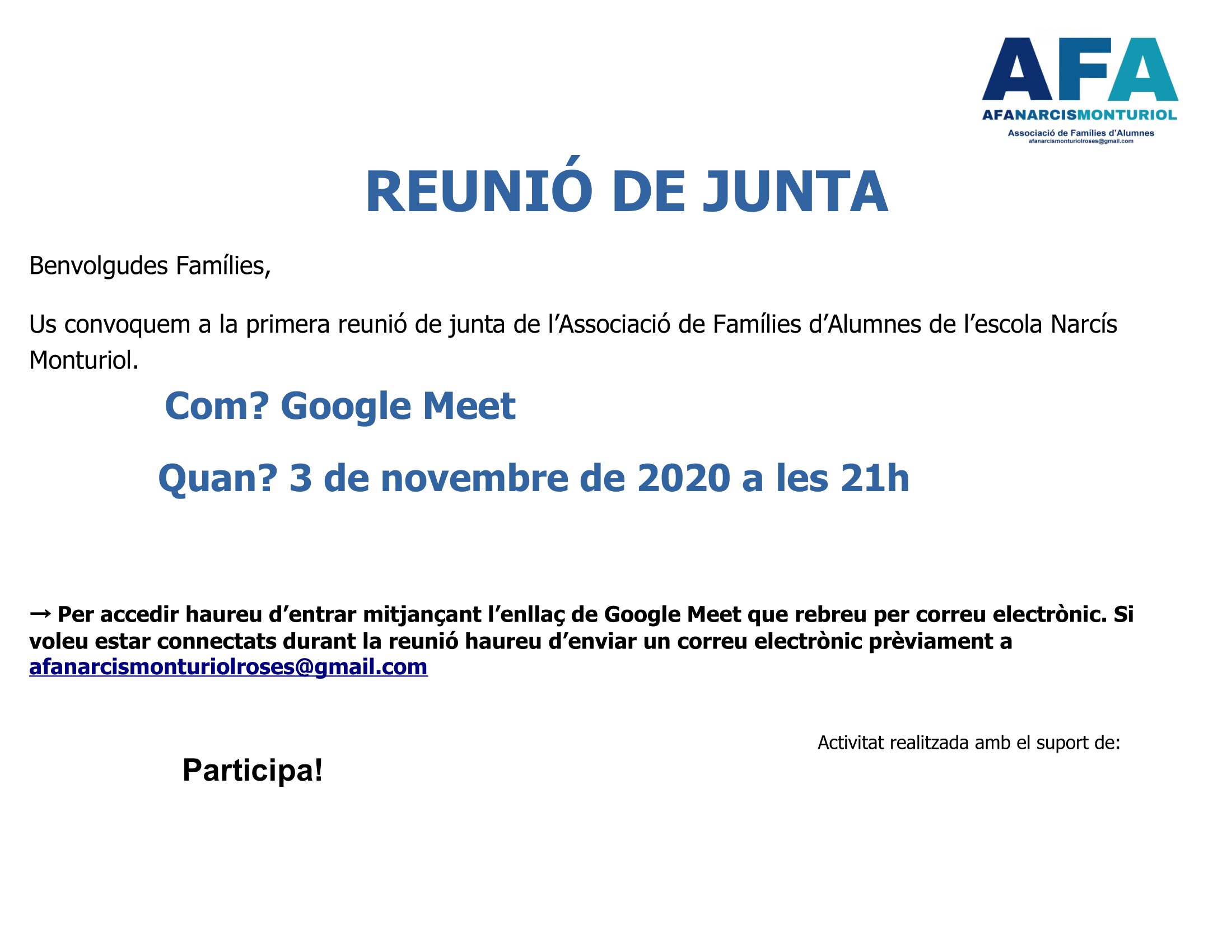 Us trametem la informació relativa a la primera reunió de la junta de l’AFA de l’Escola Narcís Monturiol, que tindrà lloc dimarts 3 de novembre a les 9 del vespre, per Google Meet.