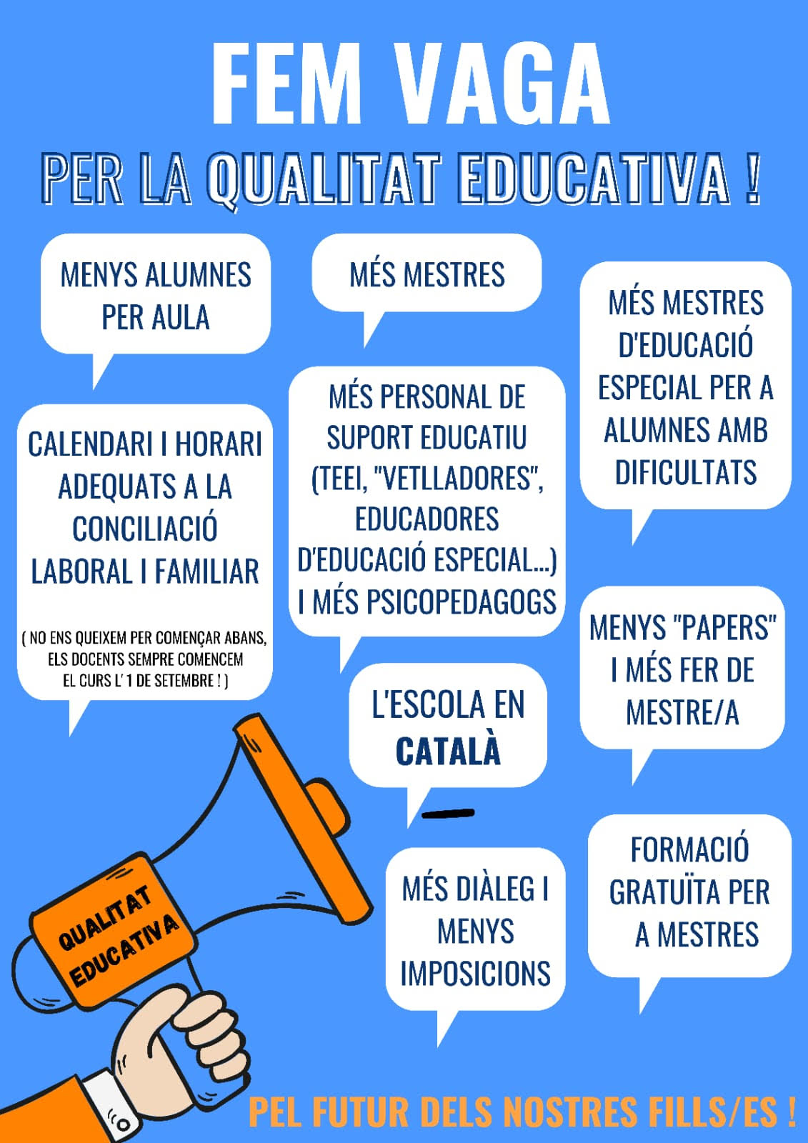 La vaga, amb les seves reivindicacions concretes, persegueix aconseguir millores en el conjunt del sistema educatiu. La fem pensant també en el nostre alumnat, perquè garantir una educació pública de qualitat és apostar per una societat més justa i democràtica.