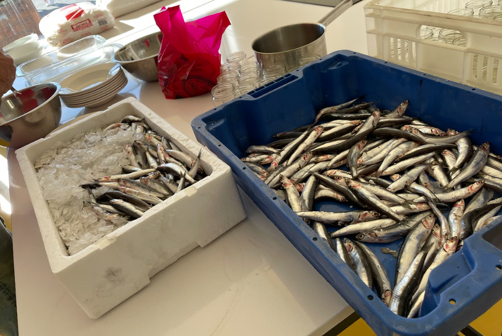 Després, ja al port, hem fet un taller de conserves d’anxoves. Ens han ensenyat el procés: hem arrencat el cap i la tripa del peix i l’hem posat en un pot de vidre amb sal grossa. D’aquí a cinc mesos ja ens les podrem menjar! També hem fet un altre taller on ens han mostrat com es fa la compra del peix a la llotja del municipi.