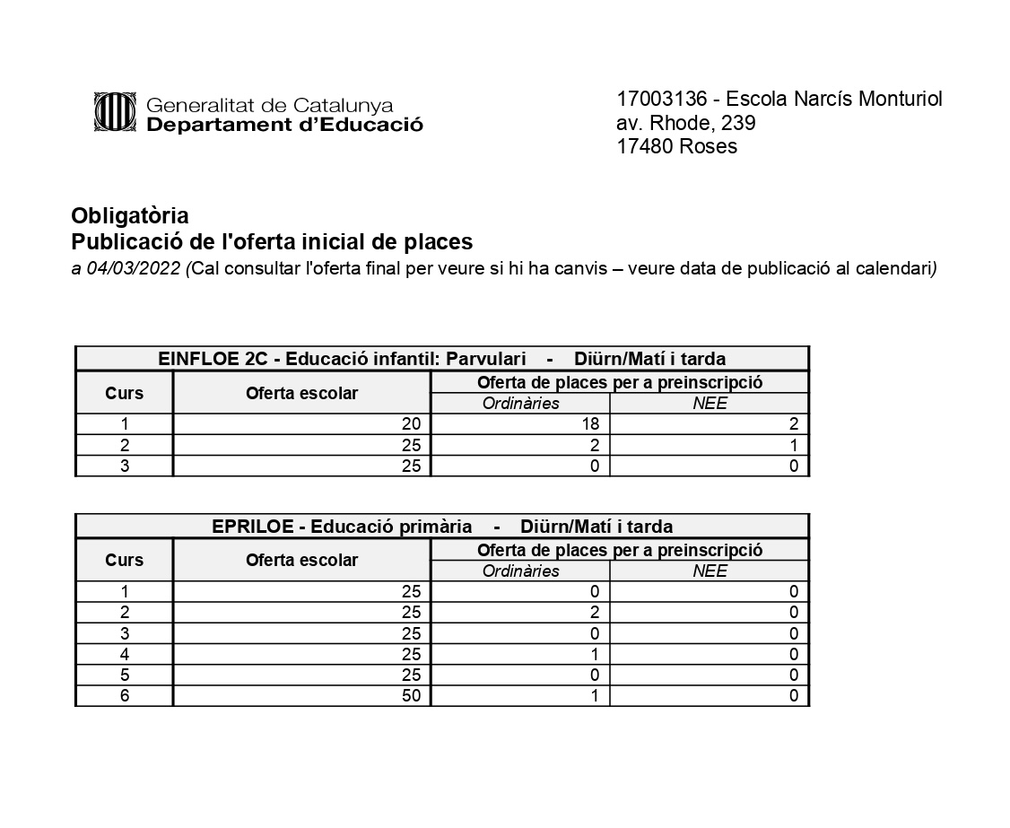 S’ha publicat l’oferta provisional de places de la nostra escola pel curs 2022-2023.