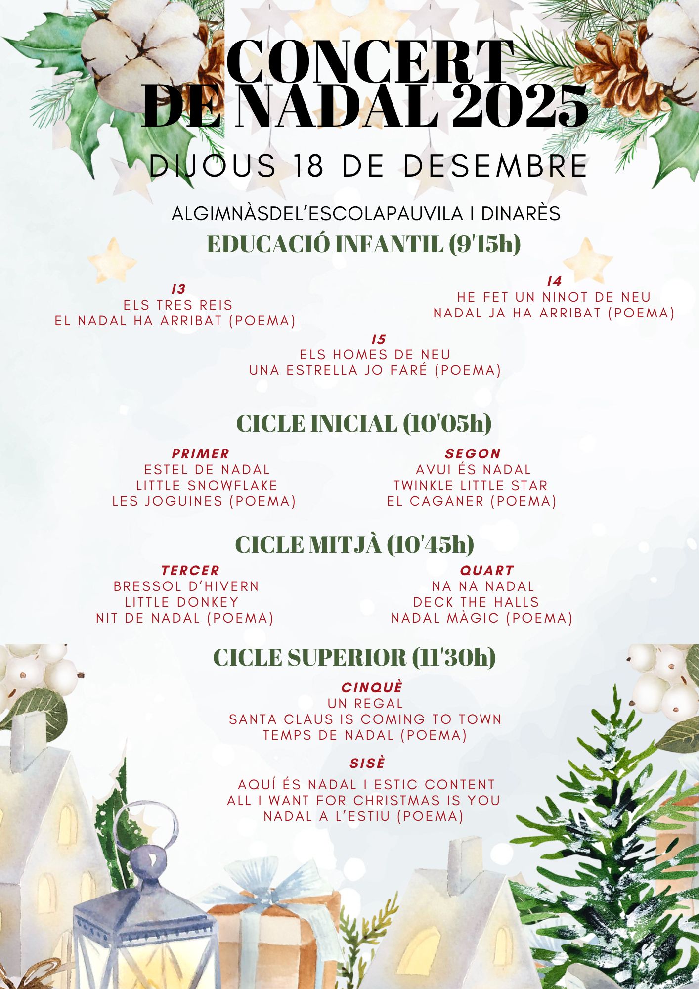 Concert de Nadal Feu un comentari / Per Escola Pau Vila i Dinarès / 15 de desembre de 2025 / General / concert, concertnadal Aquí teniu el programa del Concert de Nadal d’aquest curs 2025 – 2026. Us hi esperem 😀 !