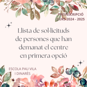 Dades preinscripció curs 24-25 Feu un comentari / Per Escola Pau Vila i Dinarès / 2 de maig de 2024 / General / llistapreinscipció, preinscripció