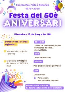 Els 50 de l’escola Feu un comentari / Per Escola Pau Vila i Dinarès / 30 de maig de 2025 / General / 50anys, 50anysdelpauvila, 50èaniversari, fem50, festadel50èaniversari, lescolafa50 Bon dia! Aquest any 2025 l’escola celebra els seus 50 anys ! Per celebrar aquest mig segle farem una festa amb activitats, música, espectacles, sopar de germanor i més. Us convidem a tothom a gaudir d’aquesta celebració.