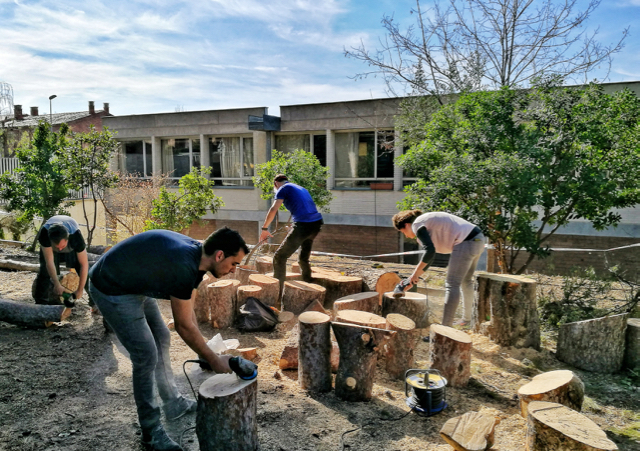 Aquesta setmana hem començat a posar mulch al bosc. El mulch és una capa de material que es posa damunt del sòl del bosc, dels jardins o dels horts perquè estiguin més tous.