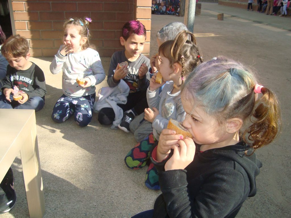 El dijous gras, a la tarda tots els nens i nenes de l’escola van sortir a berenar pa amb botifarra. Mireu els infants d’educació infantil.
