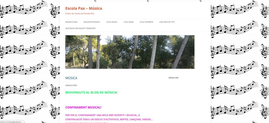 PROPOSTES MUSICALS Feu un comentari / Per patricia / 22 d'abril de 2020 / Comunitat de Petits General Portada Primària Mireu quines propostes musicals tan especials ens ha preparat l’Anna, la mestra de música, per aquests dies de confinament. N’hi ha un munt per a totes les edats i gustos. Cliqueu la imatge i entrareu directament al BLOC DE MUSICA.