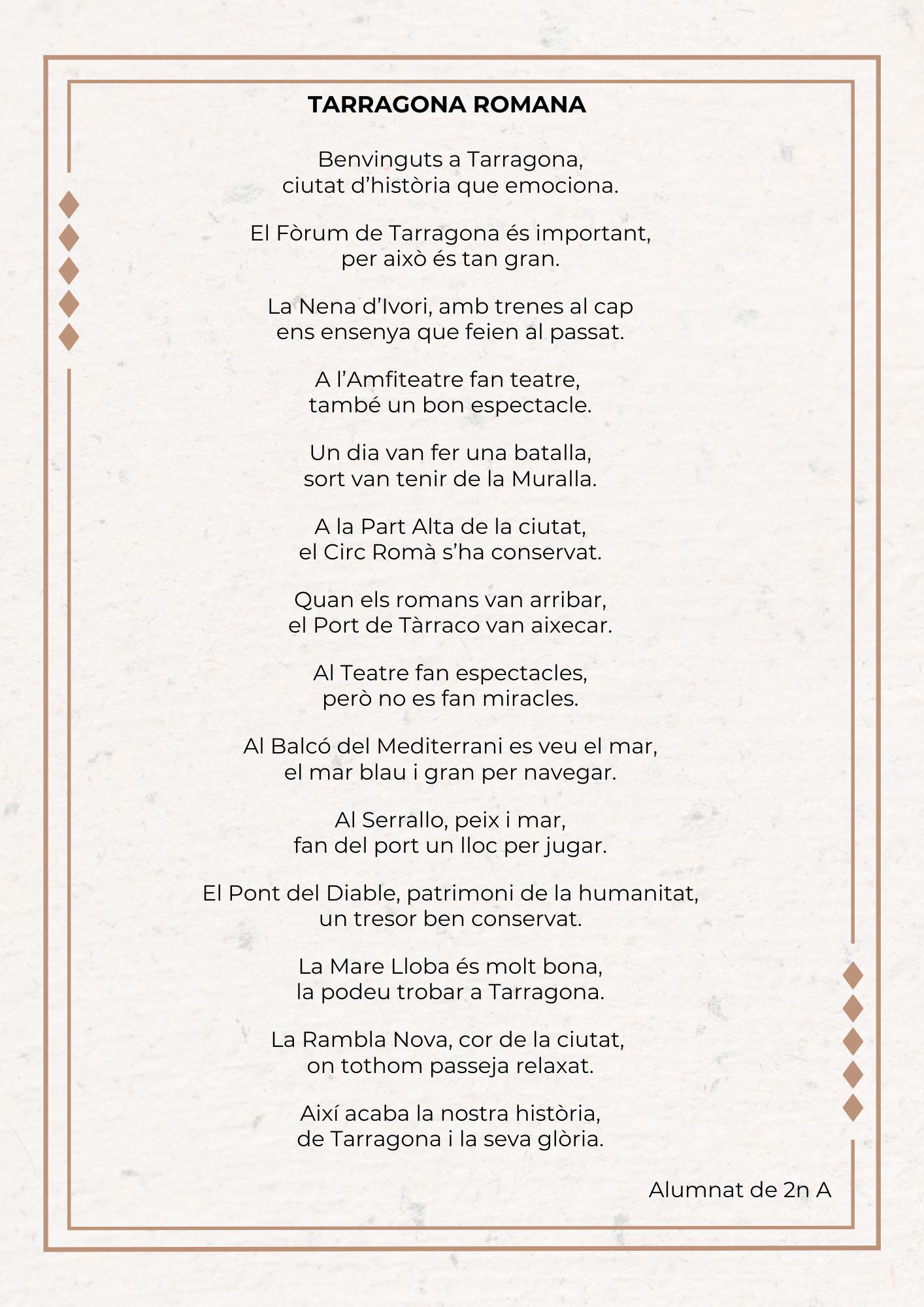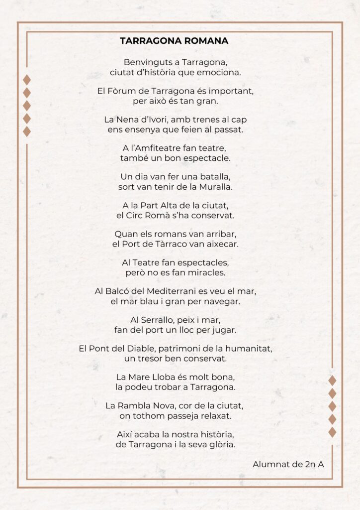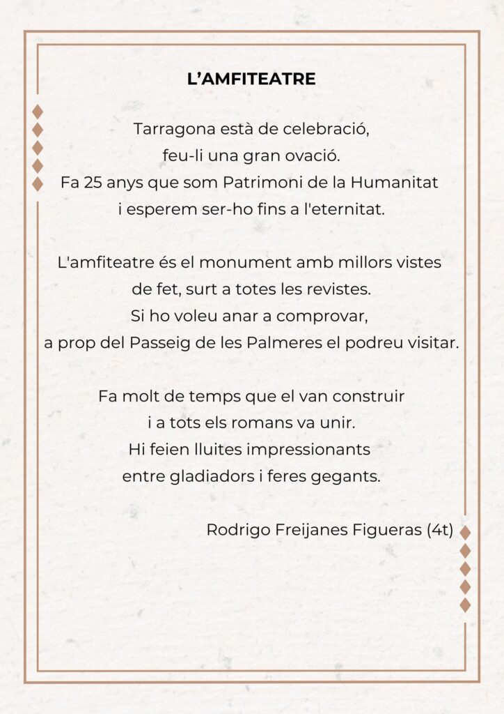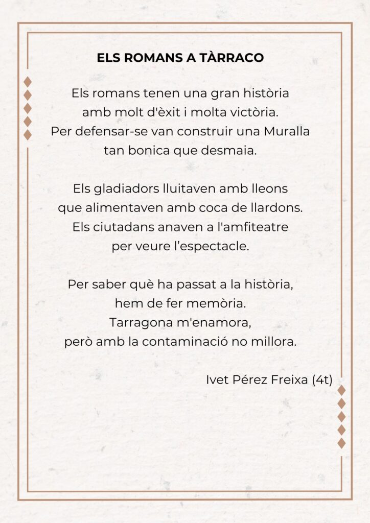 L’acte de lliurament de premis va estar ple de música i poesia i tots els seleccionats i seleccionades de la nostra escola van ser-hi presents. La Kira, de segon, va llegir el poema del dia mundial de la poesia d’aquest any en rus i l’alumna Ivet Pérez Freixa va recollir el 2n premi de la categoria B pel seu poema “Els romans a Tàrraco”.