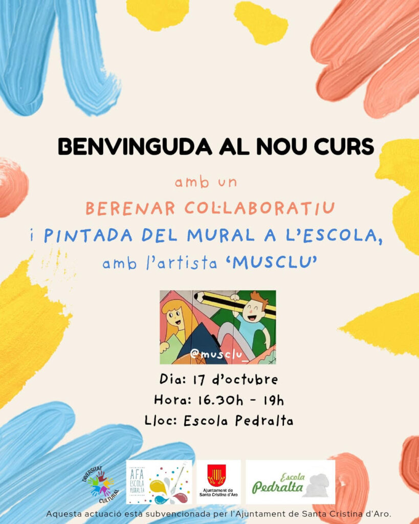 Pintarem un mural a la paret de l’entrada de l’escola, dissenyat i conduït per l’artista Musclu. Porteu roba vella que tothom hi podrà participar!