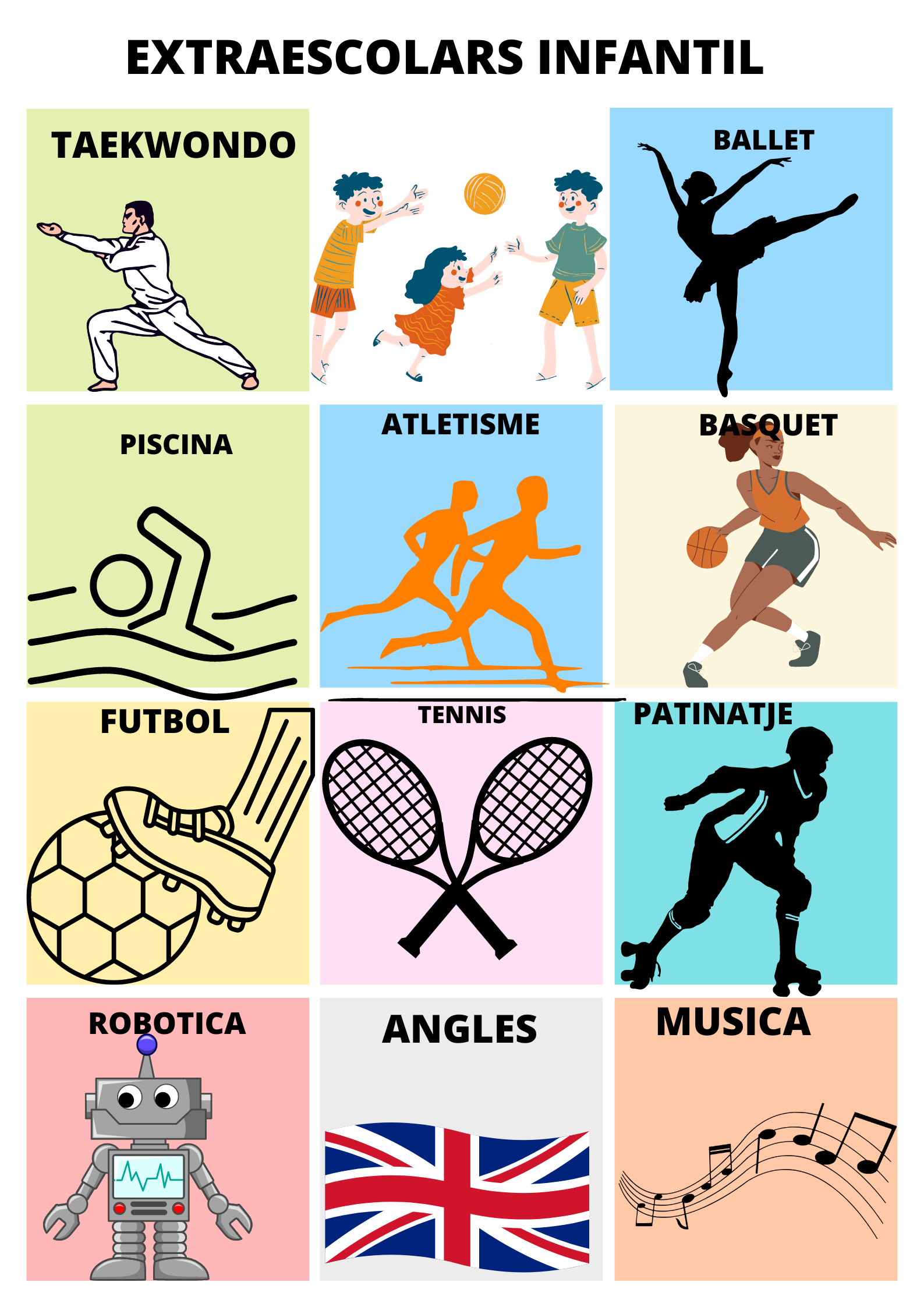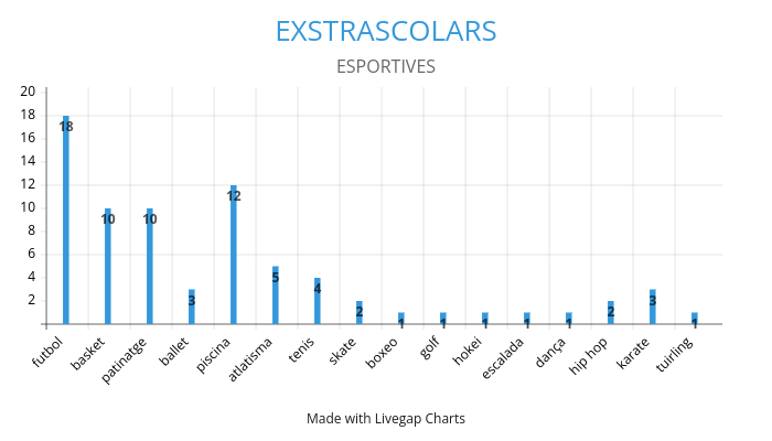 Som la Udane, la Paula, en Martà P. i en Martà D. del taller del forat del pany. Hem preguntat a tots els nens i nenes d’infantil i de primà ria quins extraescolars fan i els que més ha sortit són aquests; adjuntem també unes grà fiques que hem elaborat nosaltres.