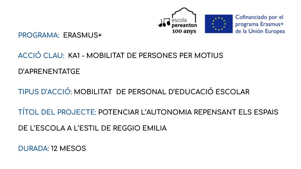 Gràcies a ERASMUS+ KA1 un equip de mestres de l’escola va poder anar a Reggio Emilia (Itàlia) on van assistir a la formació “La cultura del atelier. El enfoque educativo de Reggio Emilia”.