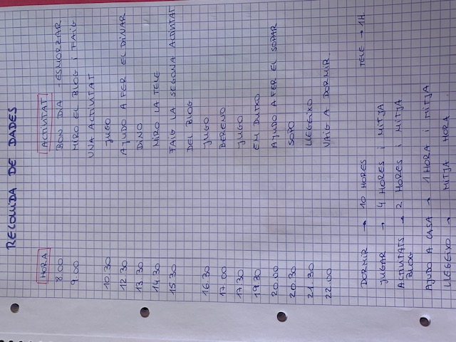 US PROPOSO QUE DURANT EL DIA D’AVUI FEU UN RECULL DE DADES HORÀRIES PER PODER FER UNA GRÀFICA DE LES ACTIVITATS QUE FEU: