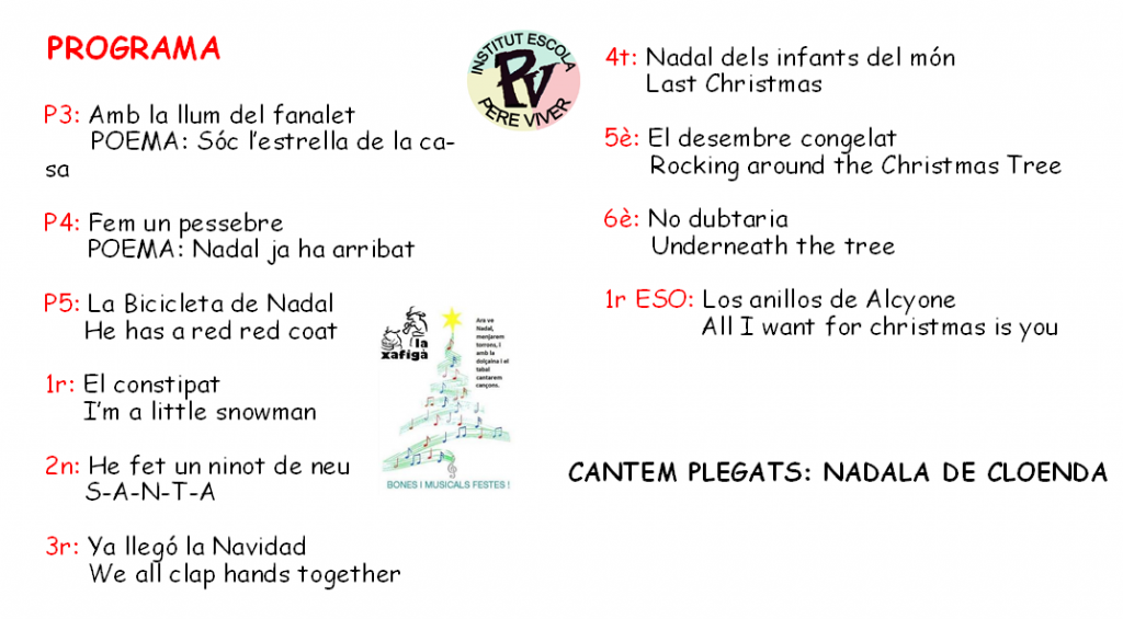 Concert de Nadal 2019 Angels Sánchez20/12/19 Avui, 19 de desembre del 2019 hem fet el concert de Nadal. Ha estat un matí meravellós ple de música i il·lusió. Aquí podeu veure els videos dels diferents concerts.