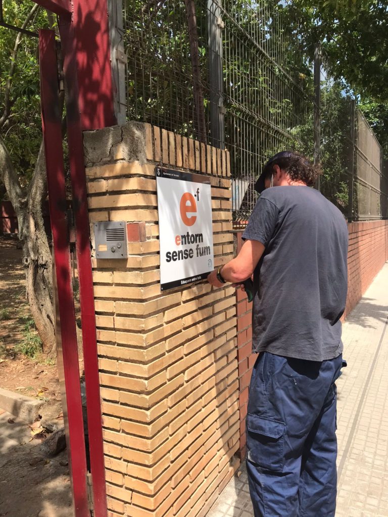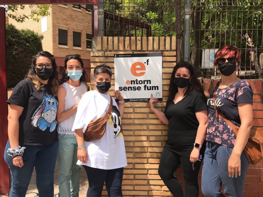 Representants de les delegades de les famílies, aquesta tarda, han col·locat a la façana del centre el cartell d’Entorn sense fum.