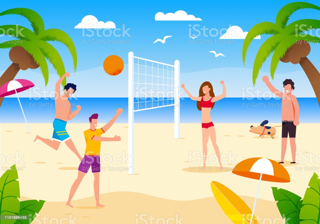 Happy Cartoon People Playing Beach Volleyball on Sand. Dog Running near. Friends Having Fun. Summer Activities. Sport, Health and Leisure. Vacation on Tropical Island. Vector Flat Illustration… Llegeix més»