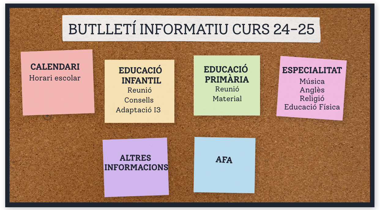 En el Butlletí Informatiu del curs 24-25 trobareu informacions del calendari escolar i l’horari, les reunions d’inici de curs, consells per l’adaptació d’I3, materials de les diferents àrees, AFA, extraescolars, xandalls, menjador…
