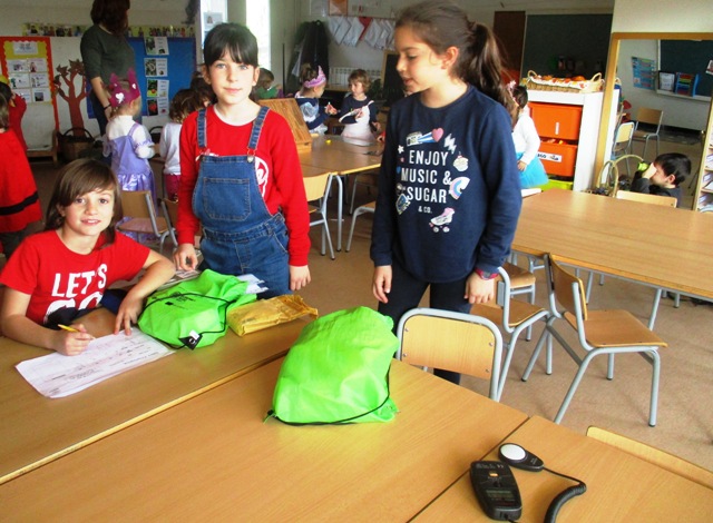 Els alumnes de quart són els encarregats de mesurar la temperatura i la lluminositat de l’escola dos cops durant el curs. Disposen d’una motxilla amb els aparells mesuradors, termòmetre i luxòmetre. Anoten les dades en unes graelles, així, podran comparar els resultats quan tornin a mesurar cap a final de curs.