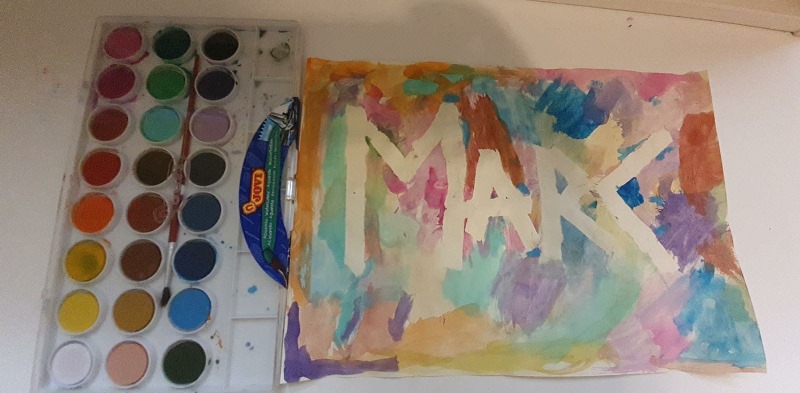 El Marc ha fet seu nom decorat amb aquarel·les. Ha col·locat unes tires adhesives per marcar el seu nom, ha utilitzat molts colors per decorar el fons, ha retirat les tires adhesives i aquest és el resultat!