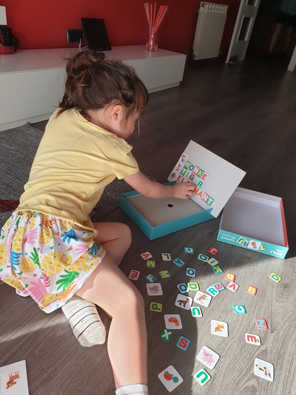 L’ Olivia troba moments per practicar els números i les lletres. Posa paraules en anglès amb el seu joc de lletres. A més, ha començat a fer sumes.