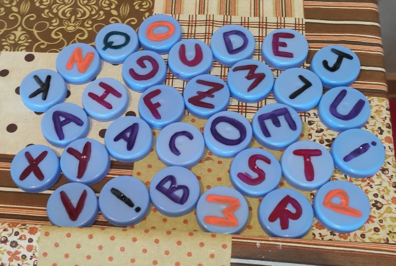 L’ Aila i la seva mare estan aprofitant tots els taps d’ampolla que han recopilat per treballar l’abecedari.
