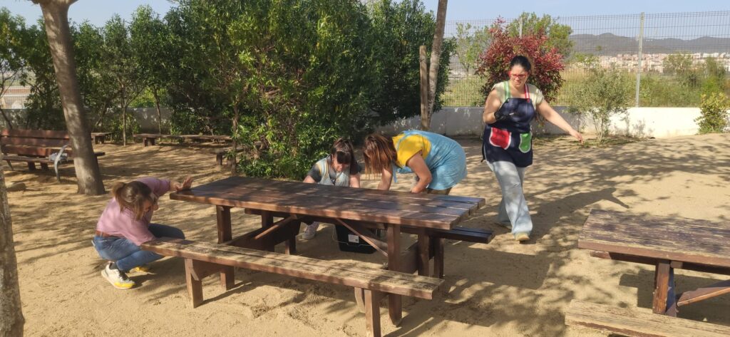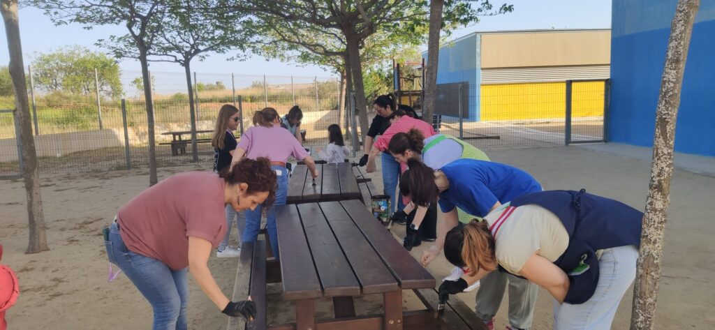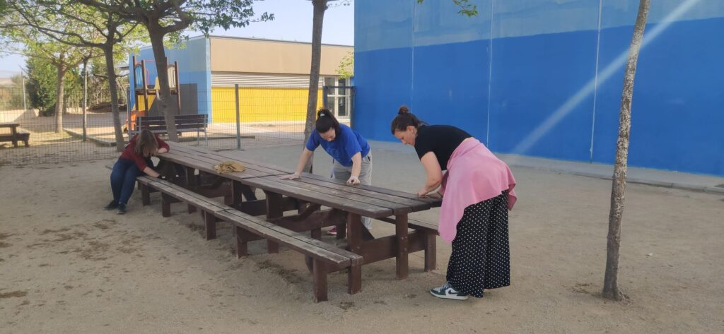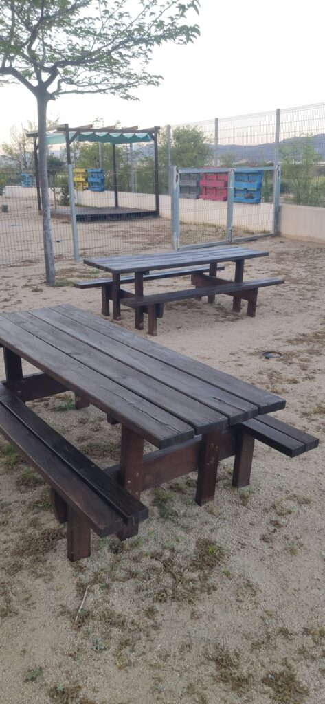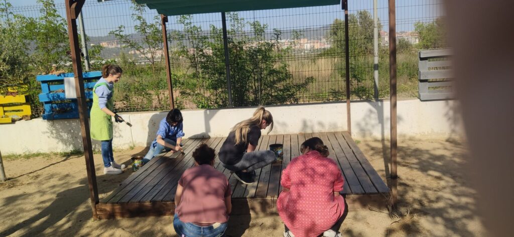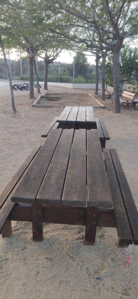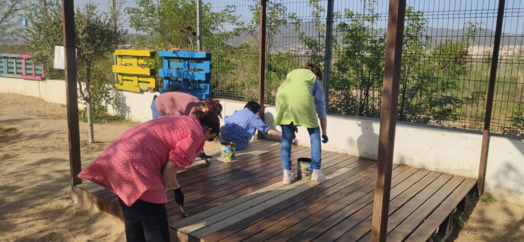 Durant la jornada, es van dur a terme diverses actuacions: es van llimar i envernissar les estructures de fusta, es va retirar la pintura del terra de la zona del porxo i es van tornar a pintar els jocs que hi havia. A més, volem destacar que la brigada de l’ajuntament va pintar el circuit de motos abans de Setmana Santa, contribuint també a la millora dels espais exteriors.