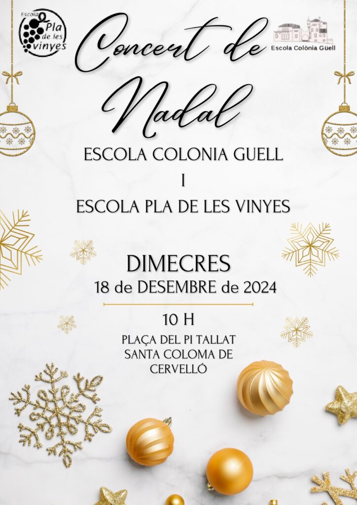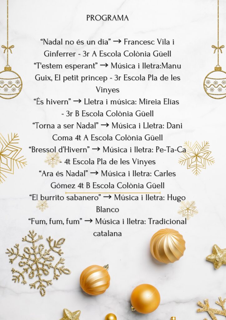 Aquest matí, els nens i nenes de 3r i 4t de la nostra escola, Pla de les Vinyes, han compartit una experiència única amb l’alumnat de l’Escola de la Colònia Güell. Junts, han protagonitzat un concert de Nadal a la Plaça del Pi Tallat, oferint una actuació molt especial per a totes les famílies que han vingut a gaudir de l’esdeveniment.