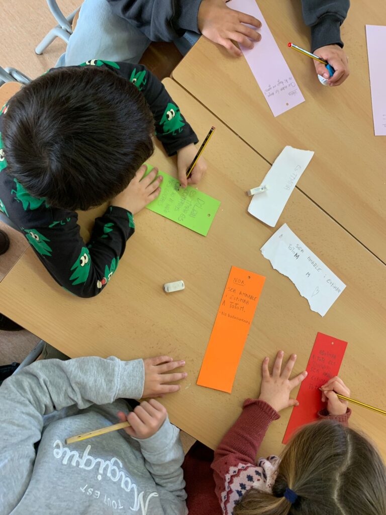 Avui 30 de gener, a la nostra escola hem celebrat el Dia Internacional de la Pau i la No-Violència amb una activitat molt especial. Cada infant ha escrit un missatge positiu sobre la pau, la convivència i el respecte, que després hem exposat al vestíbul de l’escola.