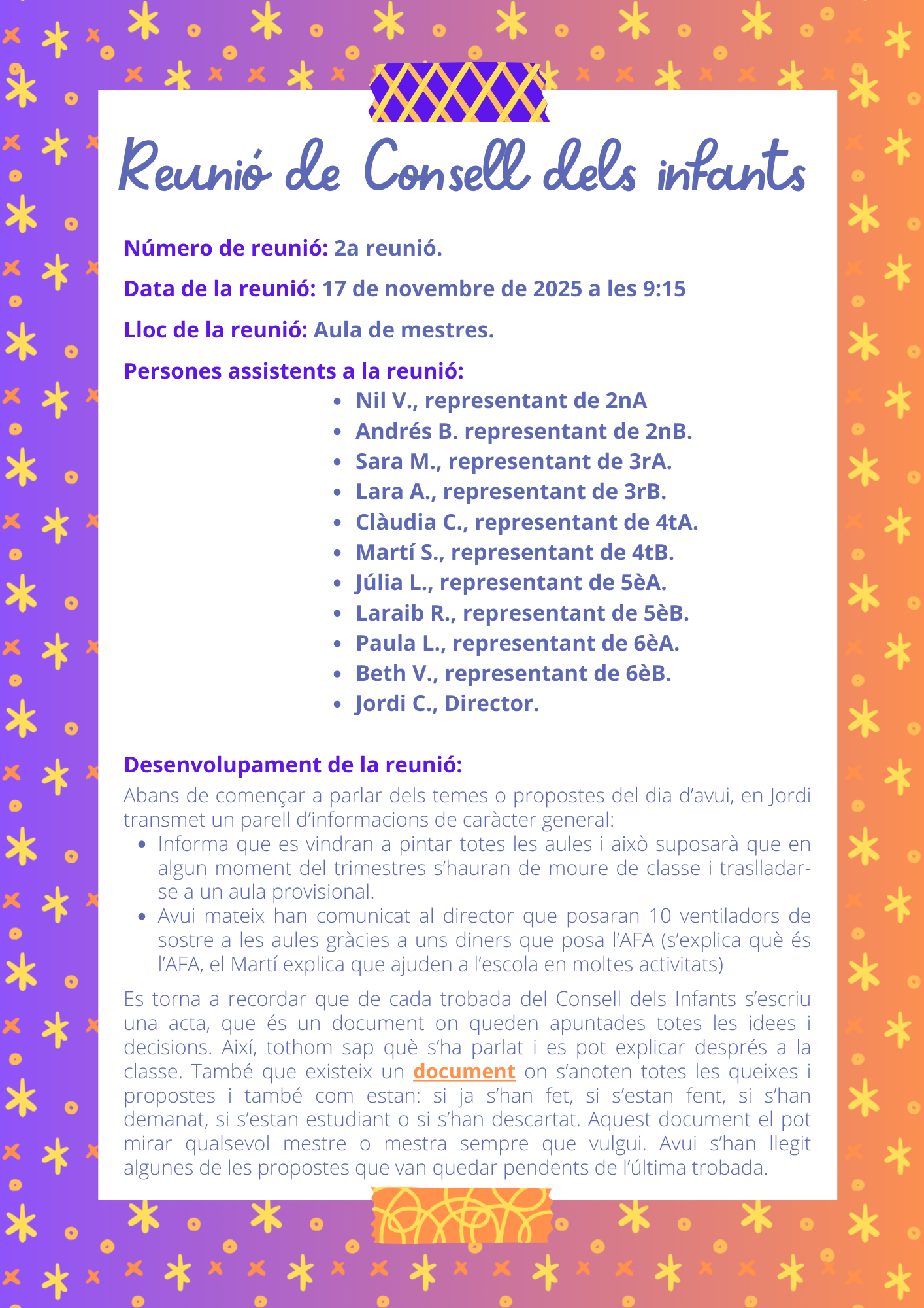 El passat 17 de novembre es va celebrar la segona reunió del Consell dels Infants d’aquest curs. Els representants de les classes de 2n a 6è es van tornar a trobar per compartir les idees, propostes i preocupacions que havien recollit a les seves aules, amb l’objectiu de continuar millorant la nostra escola entre tots i totes.