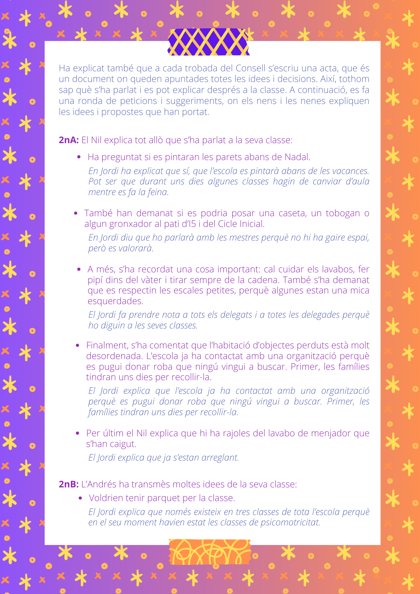 Tot seguit, es va recordar el funcionament del Consell: cada reunió queda recollida en una acta i totes les propostes es registren en un document de seguiment que permet saber si una petició ja s’ha fet, està en procés o s’està estudiant. Això ajuda a donar continuïtat a les idees de l’alumnat.