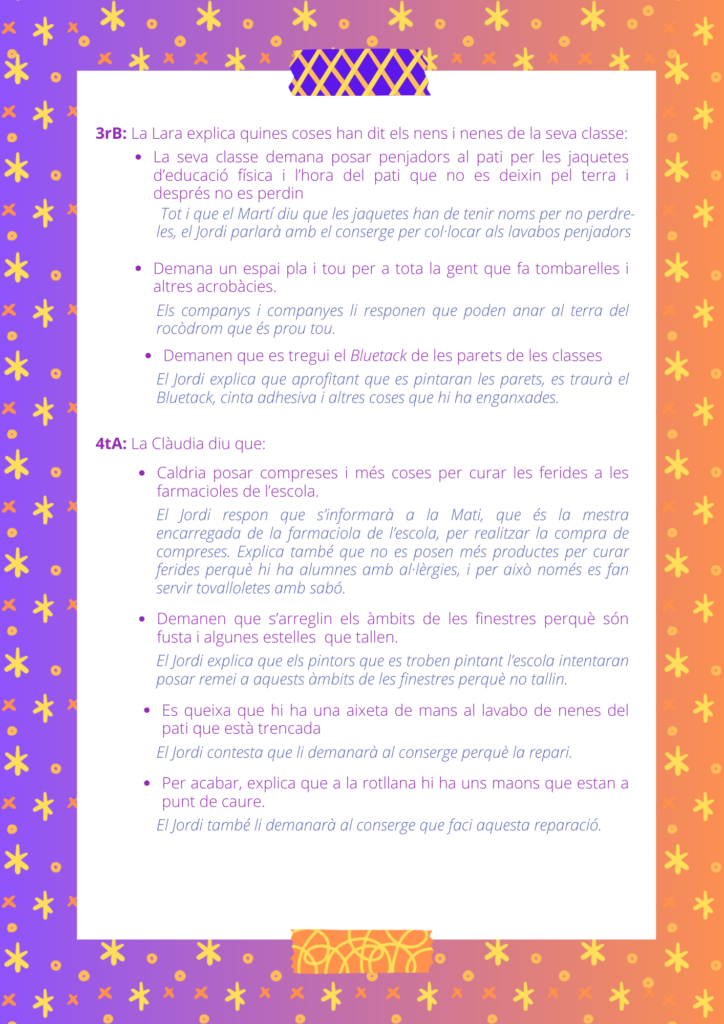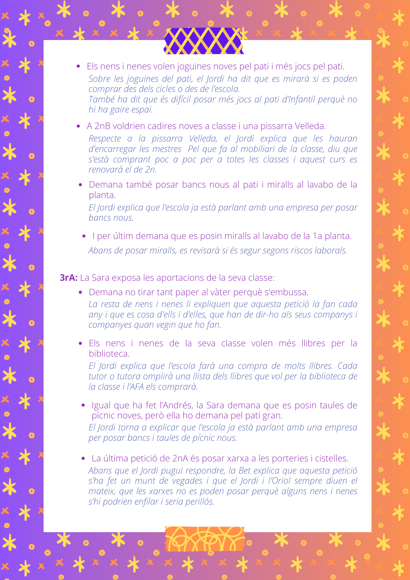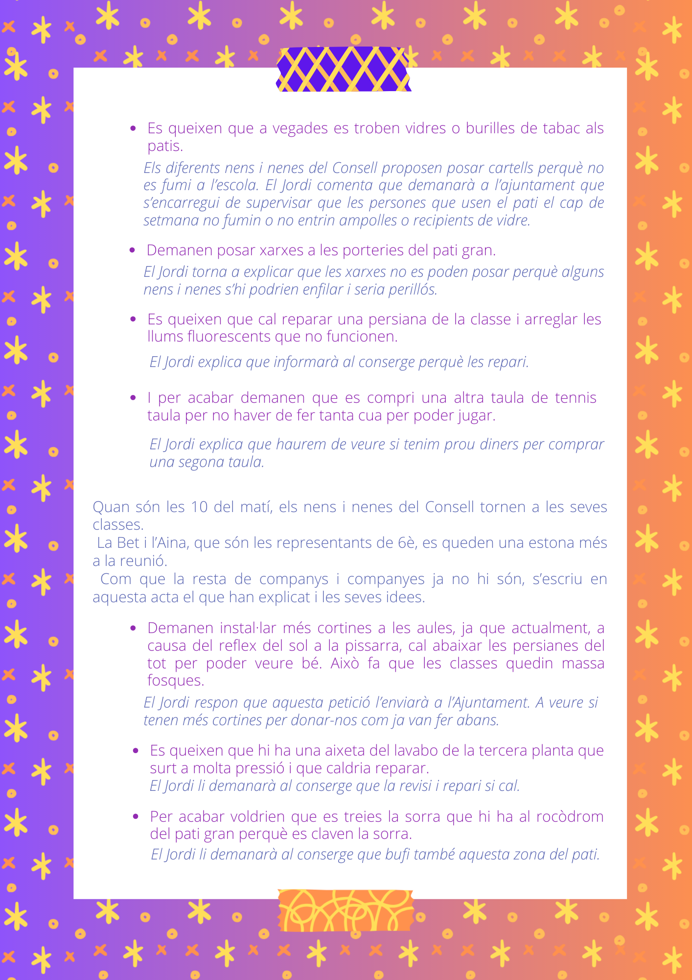 Quan la reunió ja arribava a les 10 del matí, la majoria de representants van tornar a classe. Les alumnes de 6è van aprofitar per compartir algunes propostes més, que també han quedat recollides a l’acta.