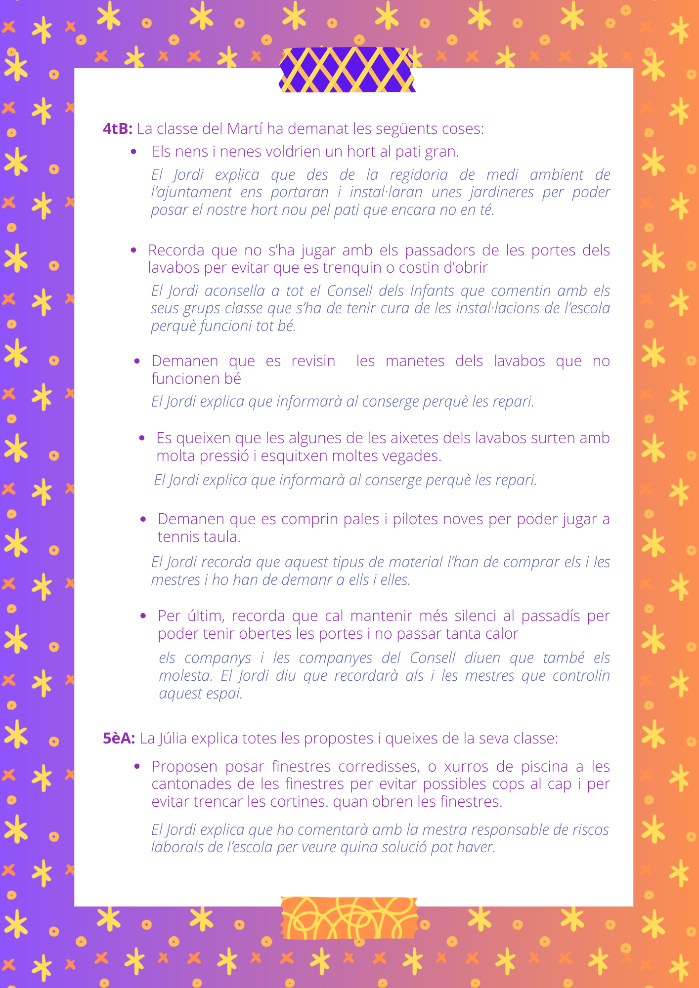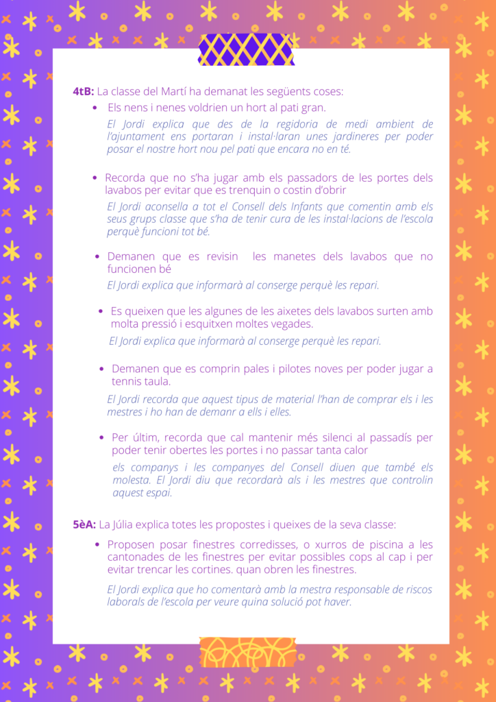 Durant la ronda de paraules, van sorgir moltes propostes relacionades amb el pati, les aules i els lavabos. Alguns dels temes més destacats van ser: