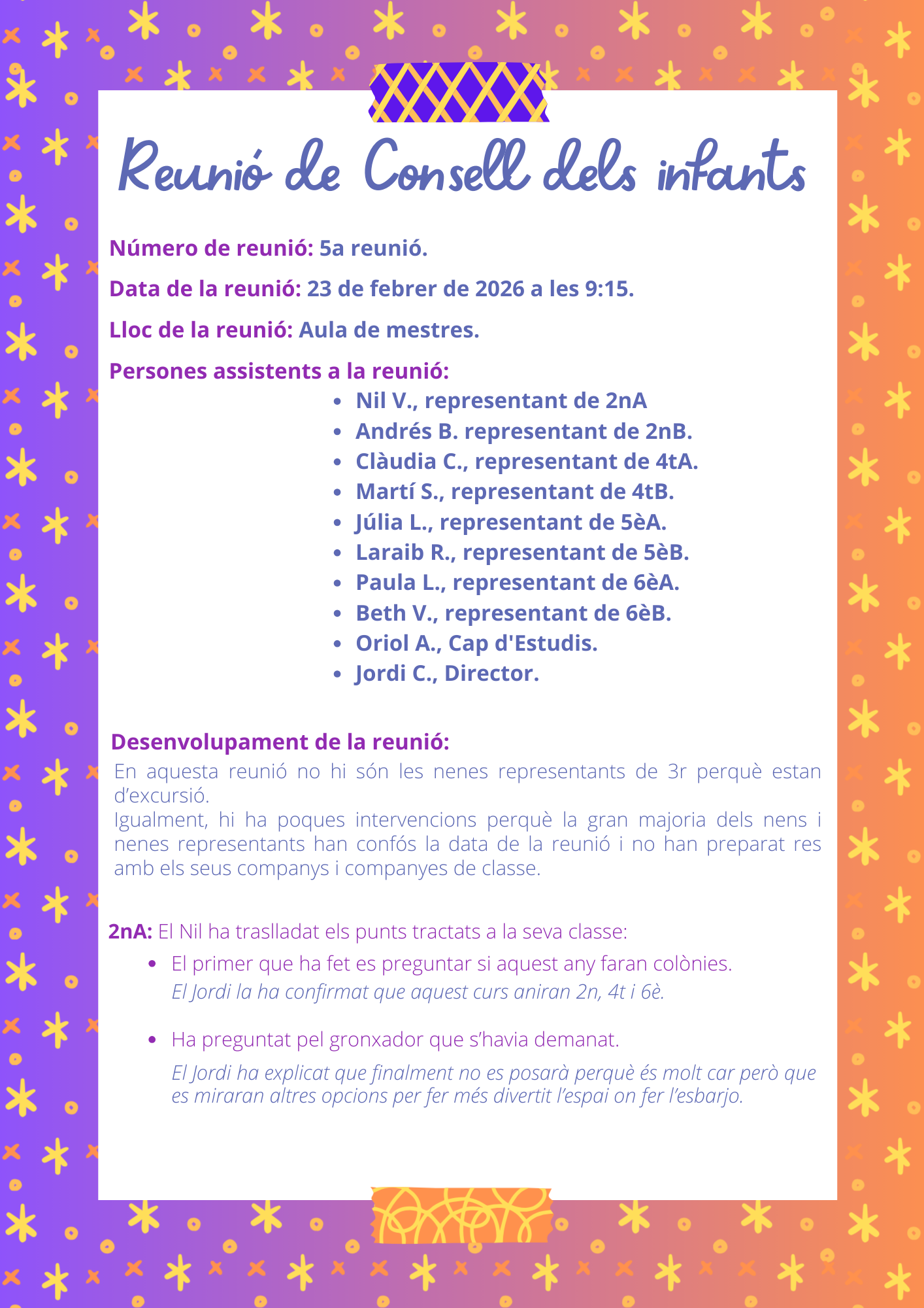 El passat 23 de febrer de 2026 es va celebrar la cinquena reunió del Consell dels Infants del curs 2025-2026 a l’aula de mestres. A la trobada hi van participar els i les representants de 2n, 4t, 5è i 6è de primària, juntament amb el director del centre, Jordi C., i el cap d’estudis, Oriol A. En aquesta ocasió, els representants de 3r no hi van poder assistir perquè estaven d’excursió. A més, hi va haver poques intervencions, ja que diversos representants havien confós la data de la reunió i no havien pogut preparar els punts amb les seves classes.