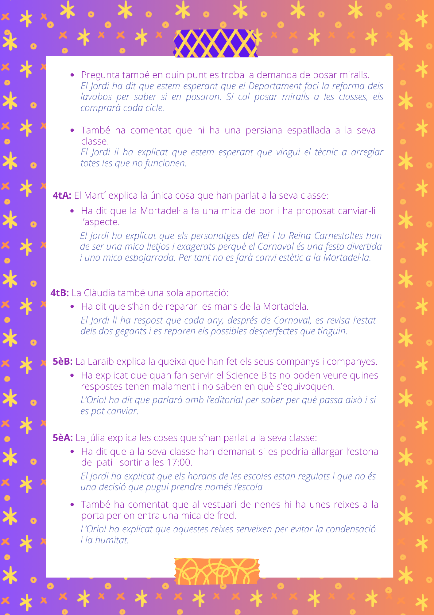 Des de 5èA, es va proposar allargar l’estona del pati i sortir a les 17:00 h. Es va explicar que els horaris escolars estan regulats i que el centre no pot modificar-los de manera unilateral. També es va comentar que les reixes del vestuari de nenes deixen entrar fred, i es va aclarir que aquestes reixes serveixen per evitar problemes d’humitat i condensació. Finalment, es van demanar retoladors per a les pissarres petites d’Innovamat; es va recordar que aquest material l’han de gestionar les tutores i, si és específic del programa, s’ha de sol·licitar a l’editorial.