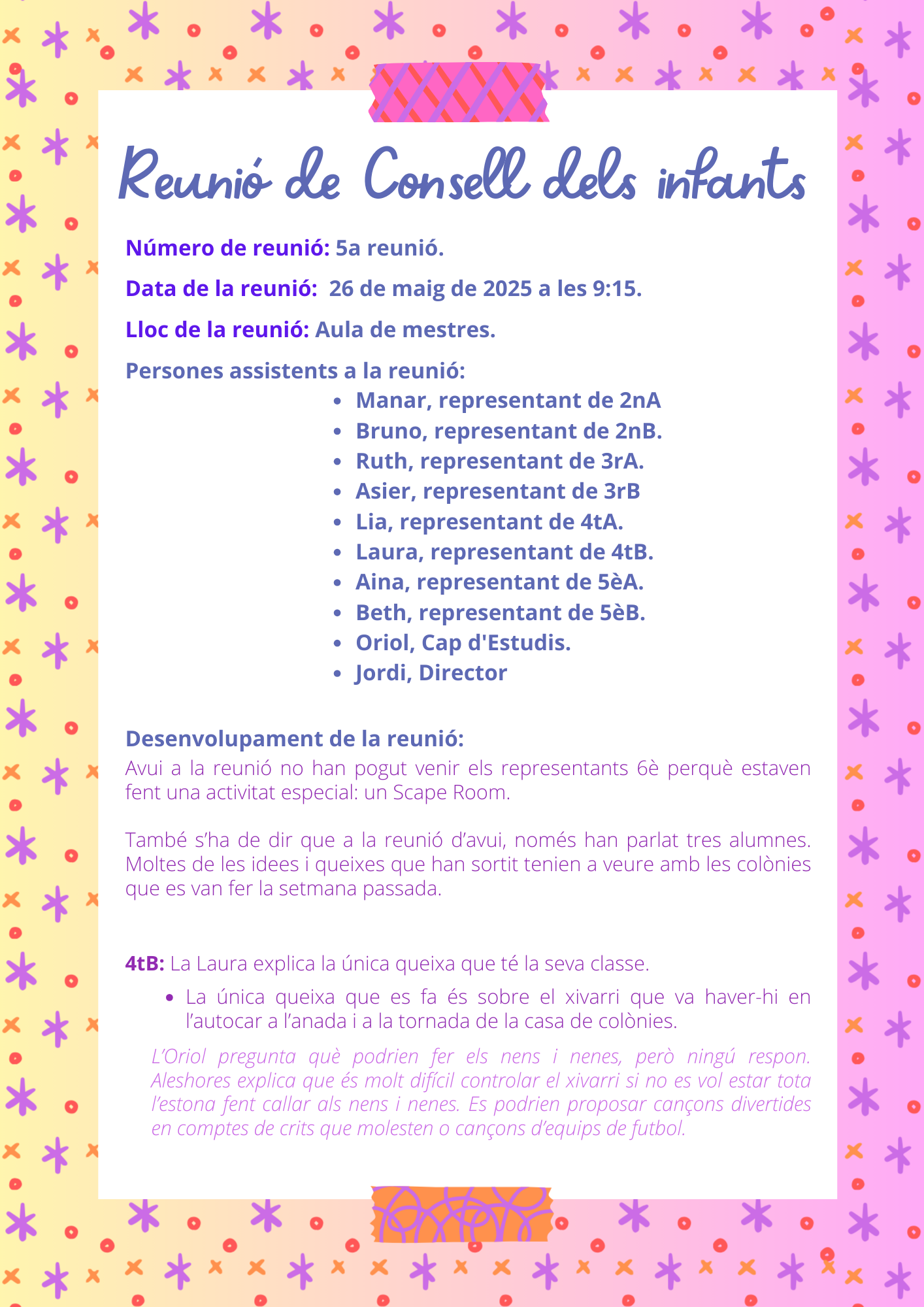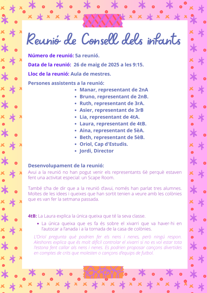 El passat 26 de maig de 2025 s’ha celebrat la cinquena reunió del Consell dels Infants, on l’alumnat de 2n a 6è ha pogut expressar les seves propostes per millorar l’escola. En aquesta sessió, els representants de 6è no hi han assistit perquè estaven fent una activitat especial.