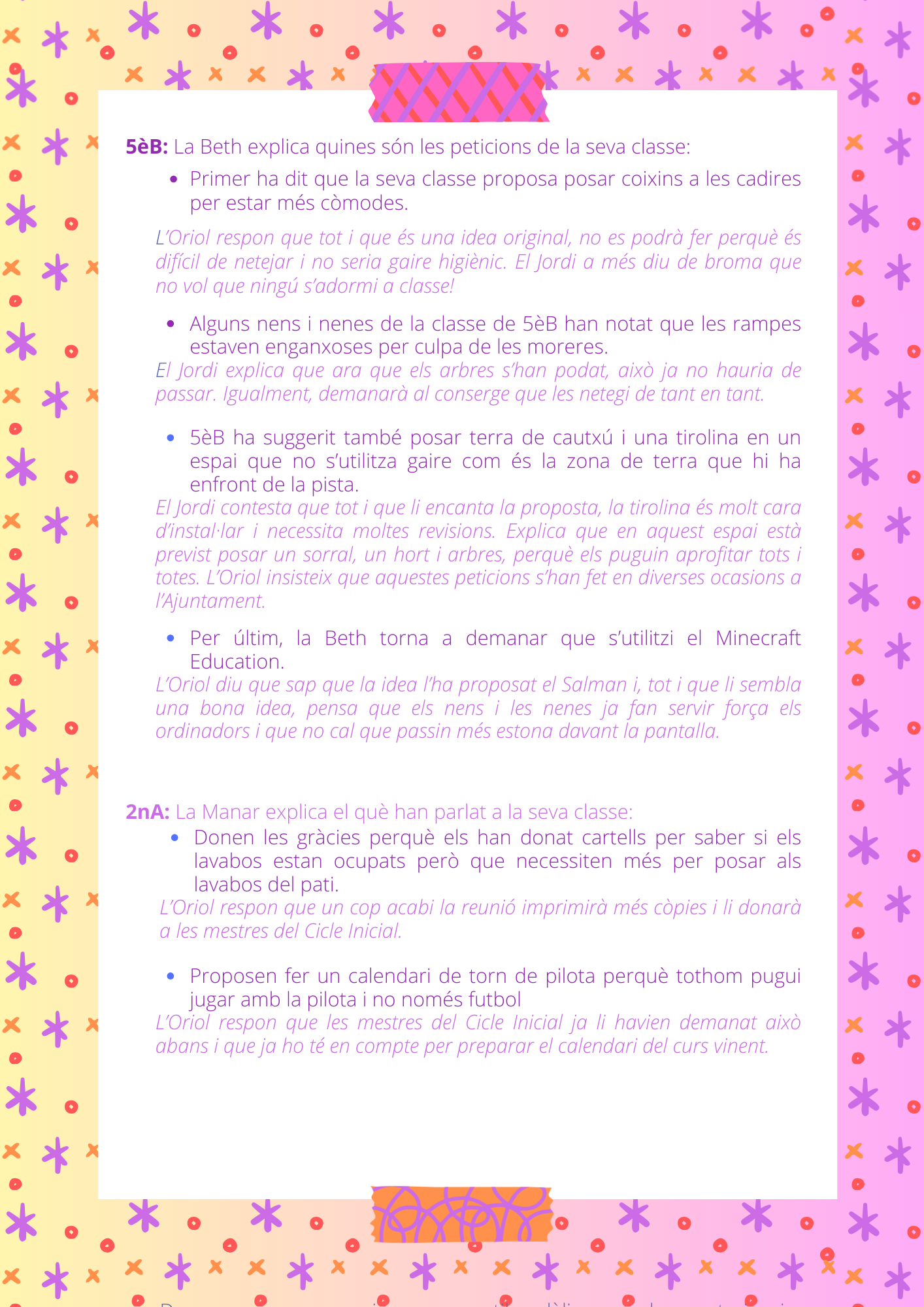 També s’ha parlat de fer torns per jugar a pilota, una proposta ben rebuda que es tirarà endavant. En canvi, s’ha descartat fer servir el Minecraft Education, perquè ja es fan servir prou pantalles a l’escola.