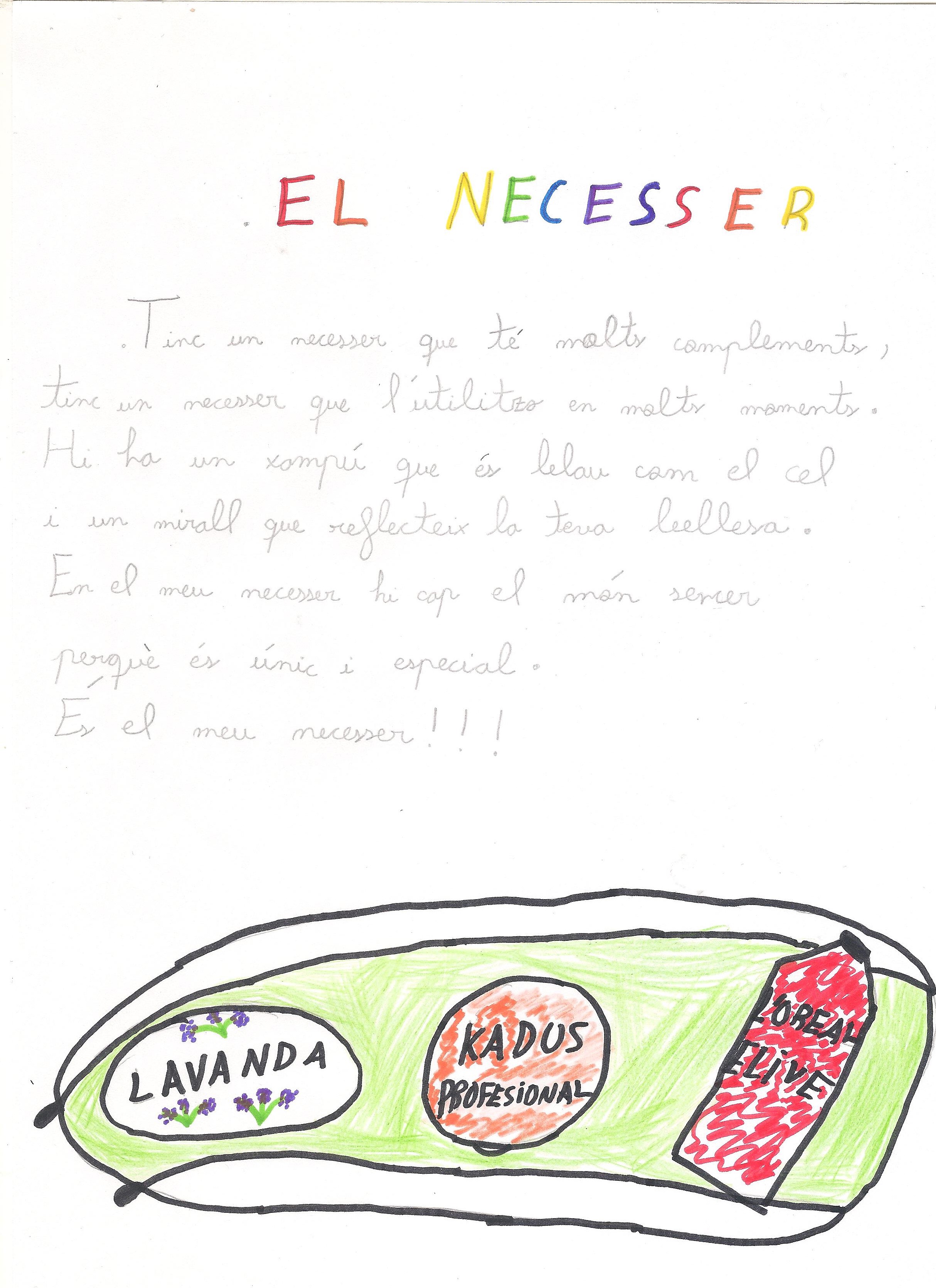 A les sessions de Biblioteca hem tingut l’oportunitat de treballar la poesia, tot parlant de com buscar aquells temes que ens emocionen, que ens inspiren, per molt senzills que siguin. L’Arnau va sentir que una de les coses que li agradaven més era el seu necesser, un regal que li han fet darrerament i que l’utilitza sovint amb molta il.lusió. D’aquí el seu graciós poema “El necesser”.