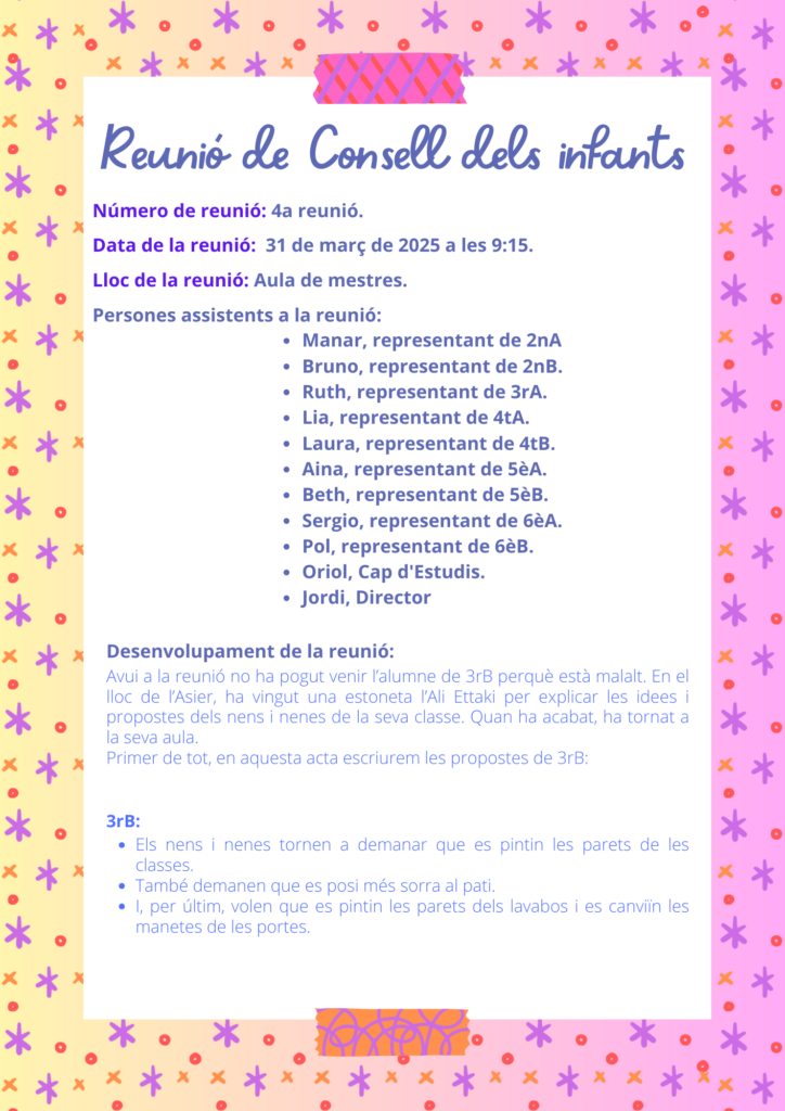 El passat 31 de desembre de 2025 es va celebrar la quarta reunió del Consell dels Infants, un espai de participació on l’alumnat de 2n a 6è proposa idees per millorar la nostra escola.